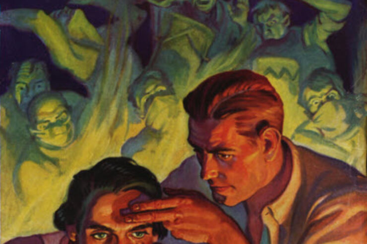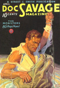 Our featured image is excerpted from Walter M. Baumhofer’s cover for the May 1933 issue of Doc Savage Magazine, illustrating Lester Dent’s “Quest of the Spider.” Baumhofer also painted the cover for the April 1934 number of the pulp which closes our post. The artist painted the cover art for the first 42 issues of Street & Smith’s Doc Savage Magazine.