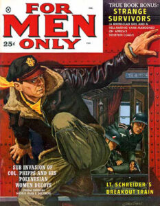Our final image is the August 1959 issue of For Men Only, published by Martin Goodman’s Magazine Management and featuring cover art by Gil Cohen. A leading artist for the men’s adventure magazine market, Cohen is probably best remembered by pulp fiction for the many covers he created for the Mack Bolan series of The Executioner novels by Don Pendleton. Still living, Cohen is also known for his aviation art, particularly from the World War II period.