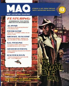 Co-editor and designer Bill Cunningham adapted the cover art for Men’s Adventure Quarterly #12 from Glenn Grohe’s cover art for the March 1954 issue of Bluebook. Born in Chicago, Glenn Grohe was an American painter and illustrator who specialized in commercial art such as magazine covers and product advertisements. His best-known work is a lithograph of a German soldier created in 1942 for the Office for Emergency Management: Division of Information entitled “He’s Watching You.”