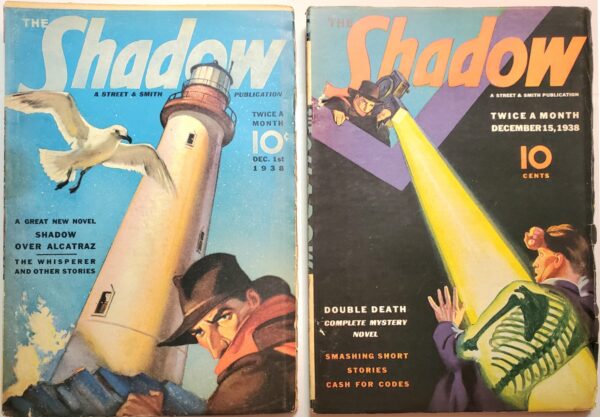 The two Shadow pulps are from December 1 and December 15, 1938, both with cover art by George Rozen. Our image is excerpted from our 2025 online photo catalog, lot number 49.