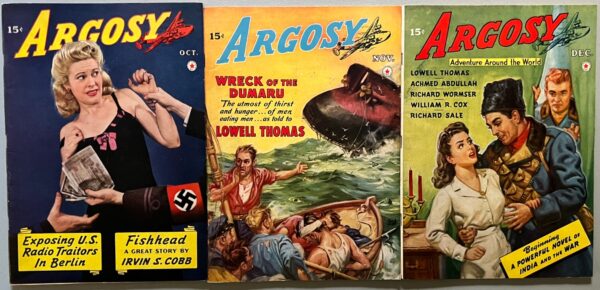 Our final image is excerpted from lot number 79 in our 2025 online photo catalog. It contains the October through December 1942 issues of Argosy. While the October issue features a photographic cover, the November issue has cover art by Emmett Watson. The cover artist for the December 1942 number is not known.