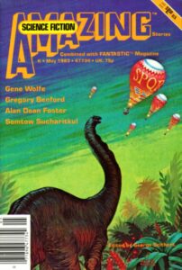 For instance, Amazing Stories published “Etchings of Her Memories” (March 1987) by Richard A. Lupoff, a quite extraordinary story treating the octopus as an intelligent creature and considering the nature of its civilization. (This was a story I’m sure Gernsback would have admired.) Then there were Paul Di Filippo’s challenging AIDS story, “Kid Charlemagne” (November 1988); Lawrence Watt-Evans’s poignant tale of a search through multiple realities, “An Infinity of Karen” (September 1988); and a whole squad of excellent stories by Kristine Kathryn Rusch.